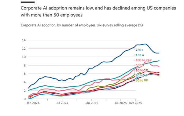 So AI technology could eventually deliver higher productivity growth if it manages to shed human labour sufficiently. But that may materialise only after a financial crash and consequent slump in the US economy.  And if the AI-driven US economy dives, so will the rest of major economies.  Time is not on the side of the Magnificent Seven.  Indeed, adoption of AI technology by companies remains low and is even falling among larger companies.