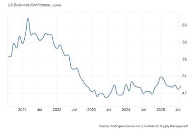 and now there are signs that the larger services sector is also in trouble. The ISM Services PMI (an economic survey indicator) fell to 50 in September 2025 from 52 in August and well below forecasts of 51.7, signalling the services sector has stalled.