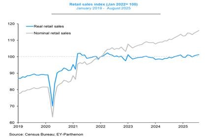 Then there is government spending.  The current closedown of government departments being imposed by Congress has given the Trump administration a further opportunity to slash federal government employment in a vain attempt to reduce the budget deficit and rising government debt.  It’s a vain attempt because Trump’s claim that increased tariff revenues will do the trick is not credible.  Tariff revenues since January 2025 are still only 2.4% of the projected total federal revenue in fiscal year 2025 of $5.2 trillion.