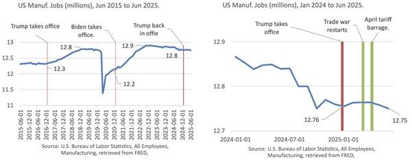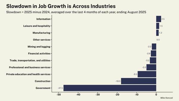 Trumponomics argued that that tariffs would build up manufacturing jobs and federal workforce cuts would free up workers for them. No chance.  Manufacturing lost jobs almost as fast as the federal workforce (-12K vs -15K).  Job growth is slowing across nearly all sectors.