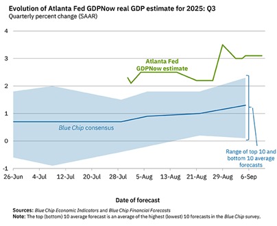 The New York Federal Reserve also has a forecasting model. The New York Fed Staff Nowcast for 2025:Q3 is currently 2.1%.  Again, this is an annualised rate, which is not the same as the quarterly rate or the year over year rate.  But so far, whatever the measure or model, the US economy is still expected to have expanded from June to September this year, if at a slower pace.