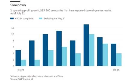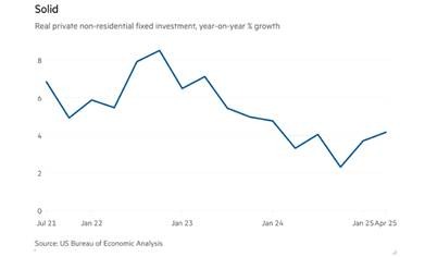 Corporate profits are still growing. Operating income for S&P 500 companies (excluding financials) grew 9% in the most recent quarter, compared with the year before. But that figure includes the mega profits of the so-called Magnificent Seven hi-tech companies. If they are excluded, then the rest of the non-financial, non-energy companies’ earnings growth is about 4-5% and slowing.  Profits growth among these companies is being squeezed by rising costs of production rise.  That will intensify as the imports tariffs drive up the prices of components and raw materials.