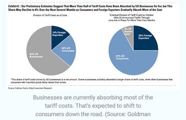 Also, some foreign exporters to the US reduced their prices to absorb the hit to import prices from the tariffs.  But tariff hikes will eventually come through to consumer prices.  Already, about 22% of tariff costs have been passed onto consumers, according to a Goldman Sachs analysis. GS reckon that will eventually rise to 67%.