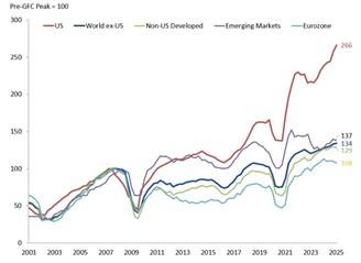 As for profits, US business has done much better than anywhere else. Since the peak before the global financial crisis, US corporate profits have surged by 166% – far outpacing other regions. By contrast, the eurozone has barely moved, with corporate profits up only 8%.