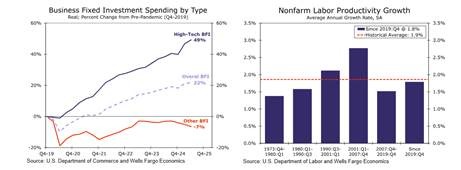 However, much of this growth in business investment is concentrated in high-tech AI spending on data centers and other infrastructure for the supposed boom in AI.  Since 2019, that sector of business investment is up nearly 50%, while the rest of US corporate investment is down 7%.  The impact of hi-tech, AI investment has budged up the growth rate in the productivity of labour slightly, but it is still below the rate of 1990s and 2000s.  If the AI investment boom falters, then business investment will plummet.